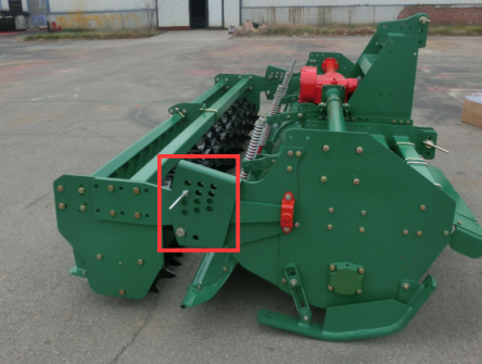 在机具的后侧设置后护板,护板上设置有压簧,如图4所示,后护板的设置起到平整的作用,有效保证旋耕后地面的平整度;护板起到挡住损坏的刀片不飞出伤到人,还对减少尘土飞扬有明显效果,从而减少尘土污染。